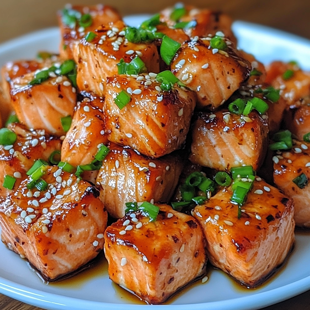 - Garnish: Remove the skillet from heat and transfer the salmon bites onto a serving platter. Sprinkle with sesame seeds and top with sliced green onions for that perfect finishing touch.