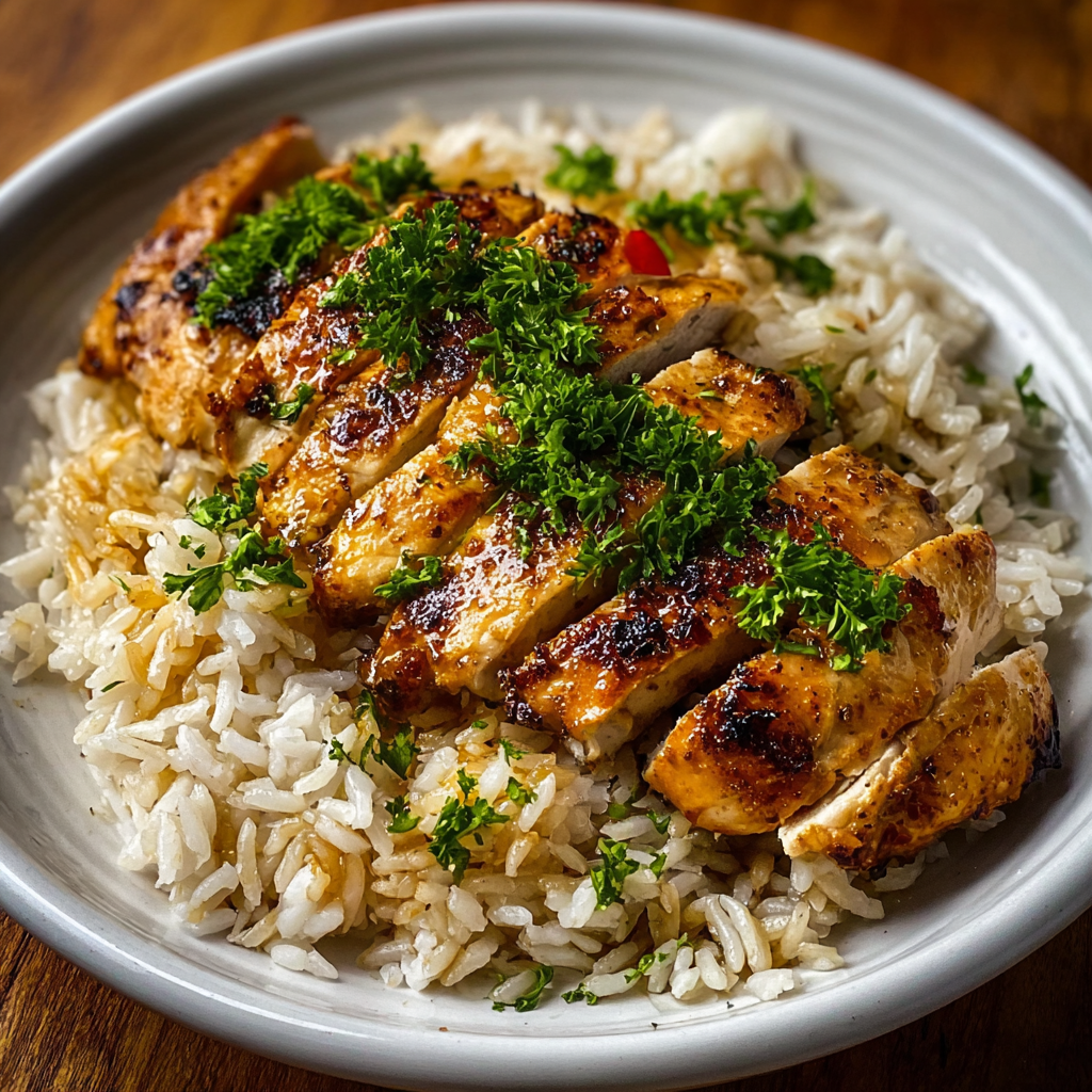 - Top the rice with the sliced chicken breasts, then garnish with fresh chopped parsley or cilantro for that pop of color.