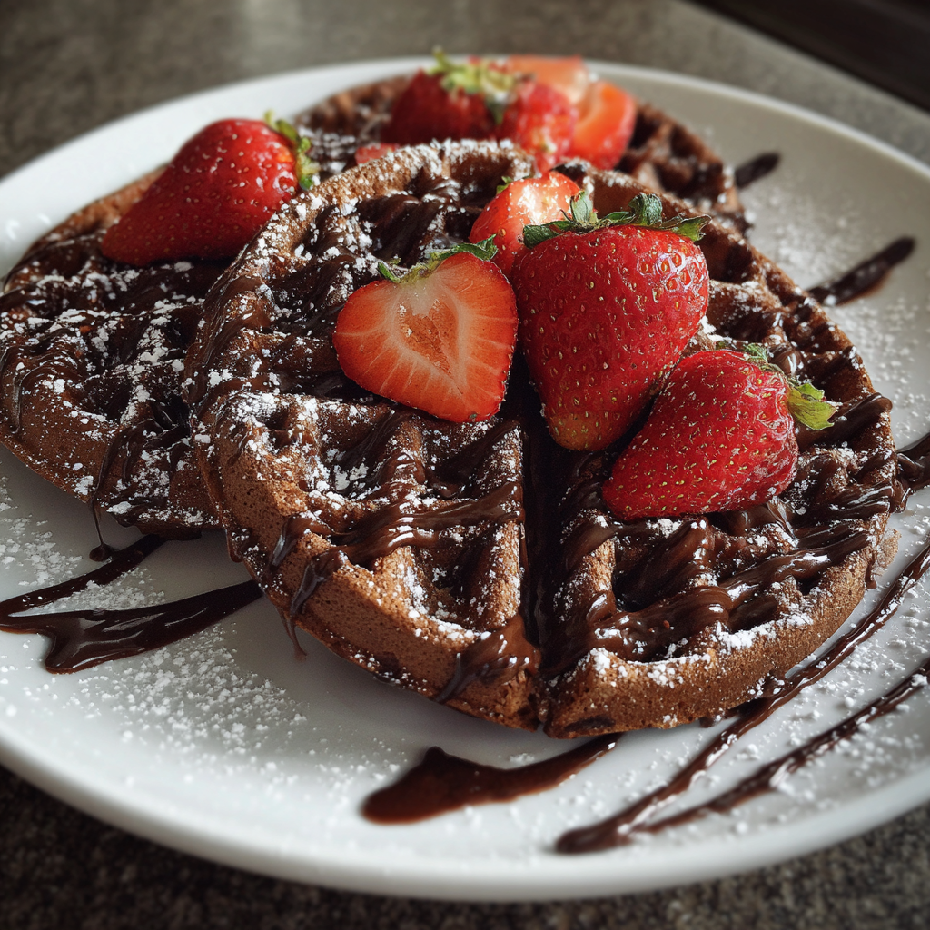 - Serve the waffles warm, topped with fresh strawberries, a light dusting of powdered sugar, and a drizzle of chocolate syrup if desired.