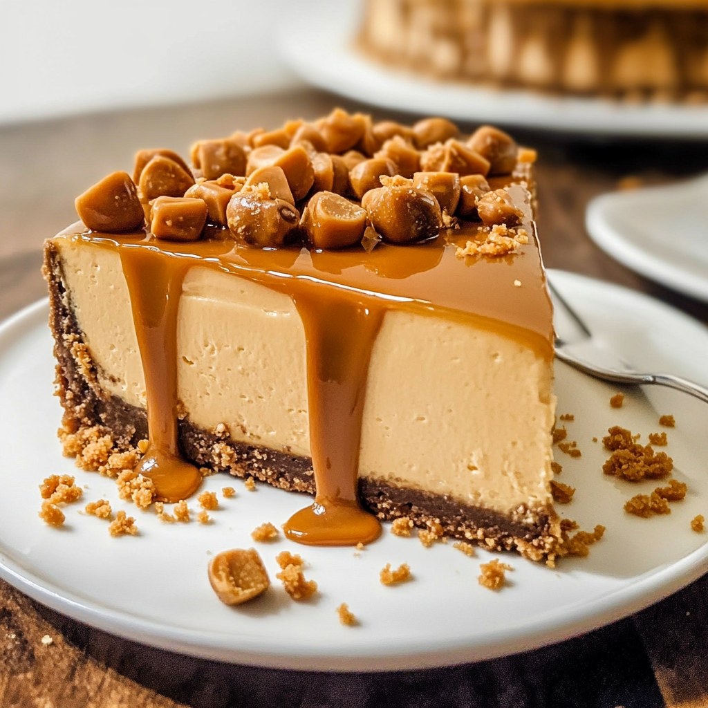 Once the cheesecake is set, carefully remove it from the springform pan and transfer it to a serving platter. Top it off with butterscotch chips and crushed graham crackers that you can gently press into the filling. Drizzle more caramel sauce over the top and pipe whipped cream around the edges if you like. Slice it up and enjoy the ultra-creamy goodness!